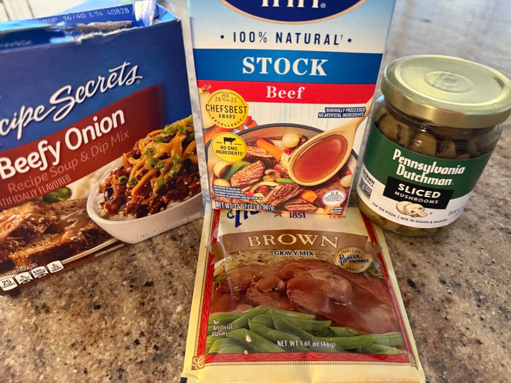 - 1 can beef broth (use the empty can of mushroom soup can to measure)