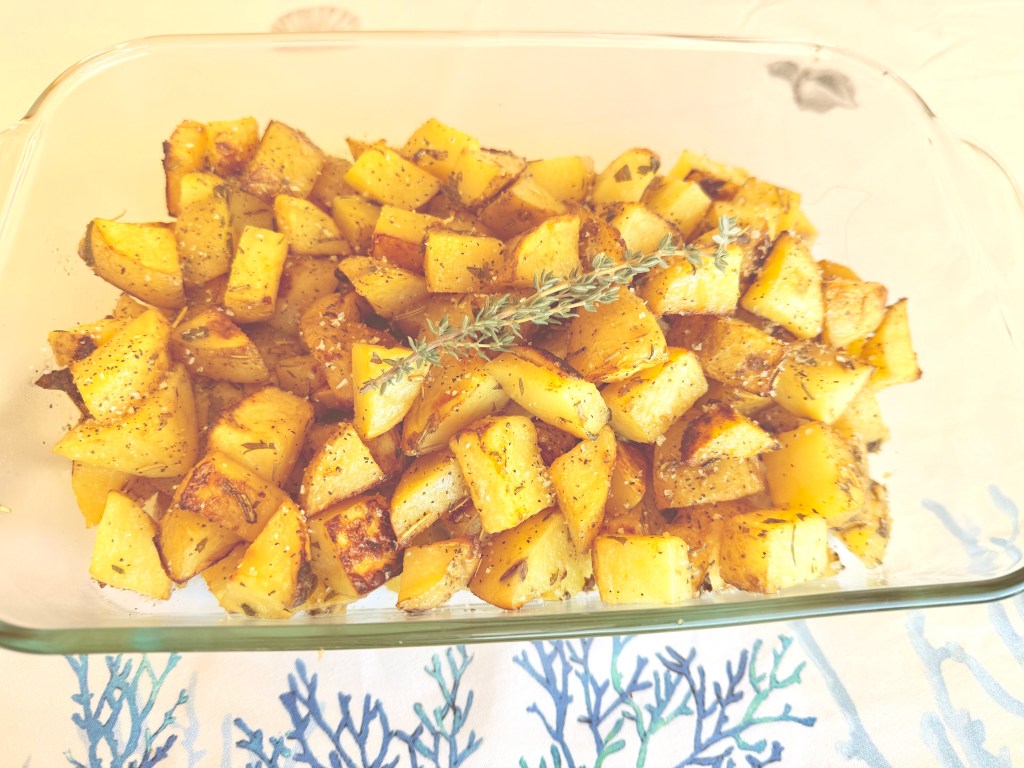 In a large bowl, combine the cut potatoes, minced garlic, parsley, rosemary, thyme, salt and pepper.