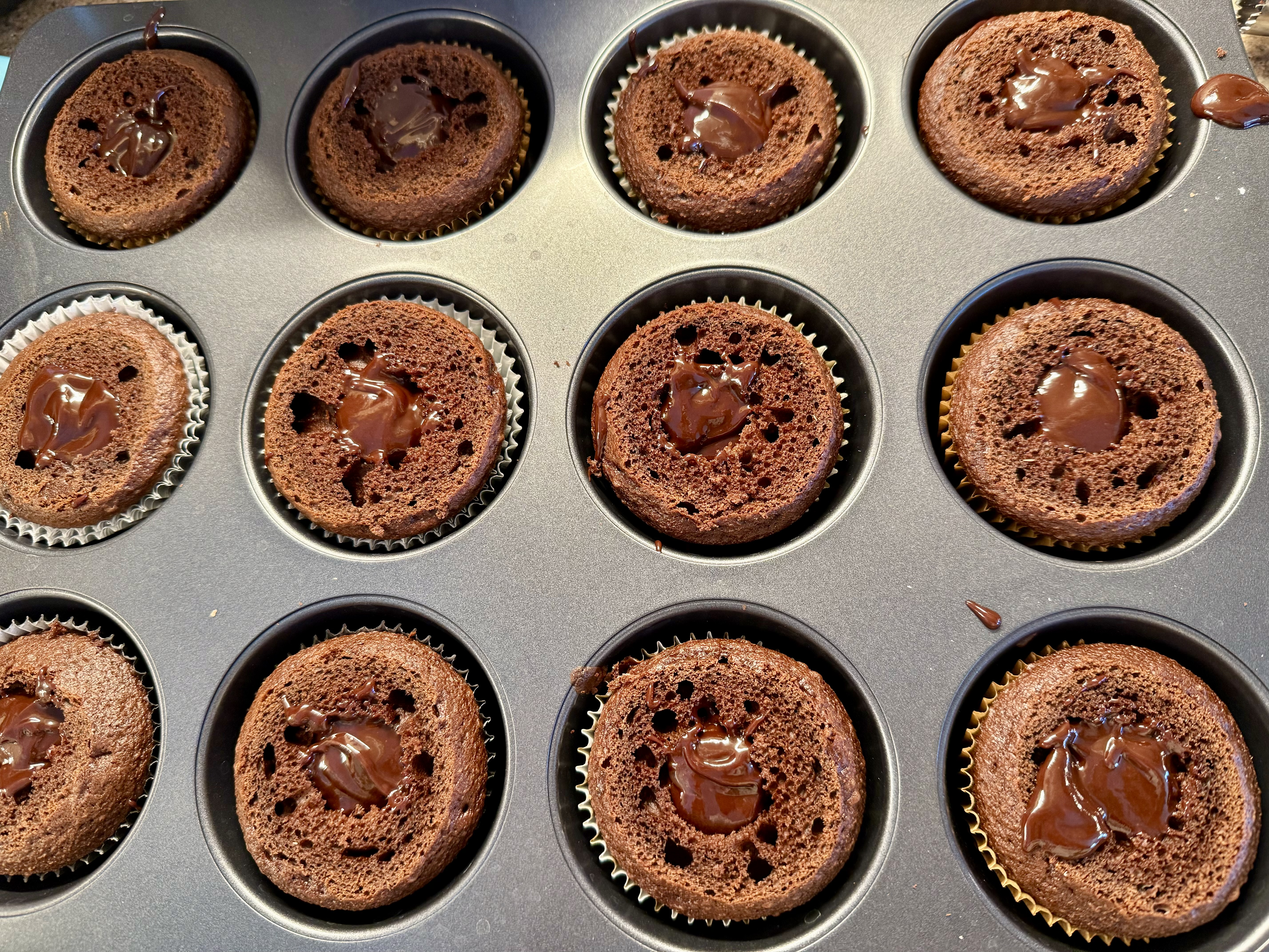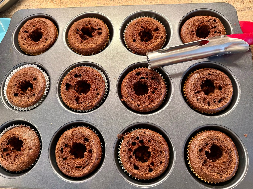 Scoop out a heaping teaspoon from each cupcake, or use Apple corer, too cream a well. Then spoon Kahlua ganache into cupcake wells.