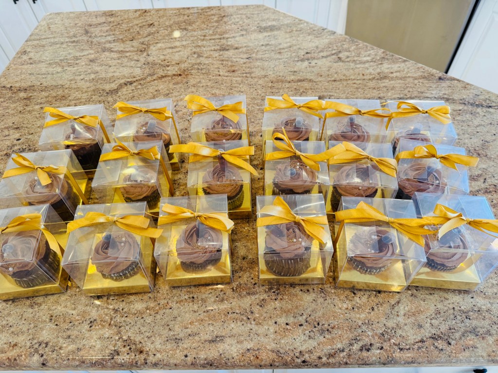 Pipe frosting on top and garnish with chocolate and gold sprinkles.