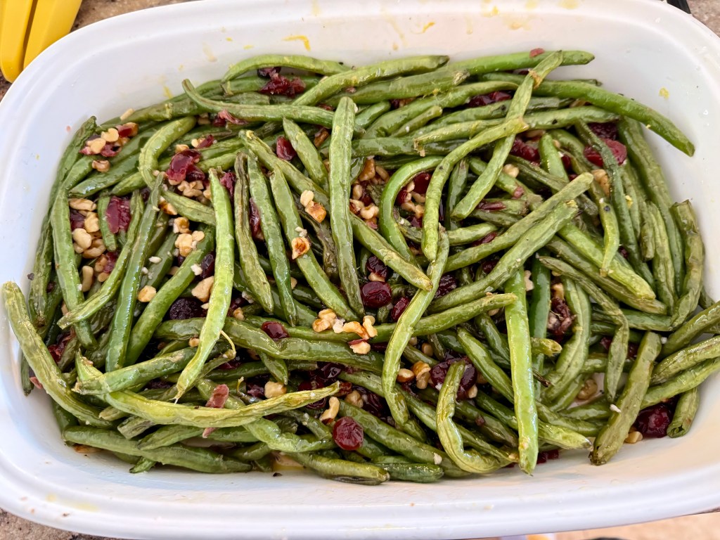 Add the lemon zest, lemon juice, drained cranberries, and toasted walnuts to the green beans. Toss well, then taste and adjust seasoning if necessary.