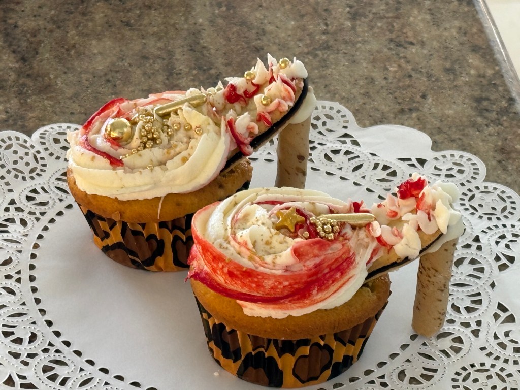 Stick a Milano cookie on the side of the cupcake. Use a Pirouette for the high heel, cut on a diagonal and stick to the Milano cookie with melted chocolate. Decorate the cupcake as desired.