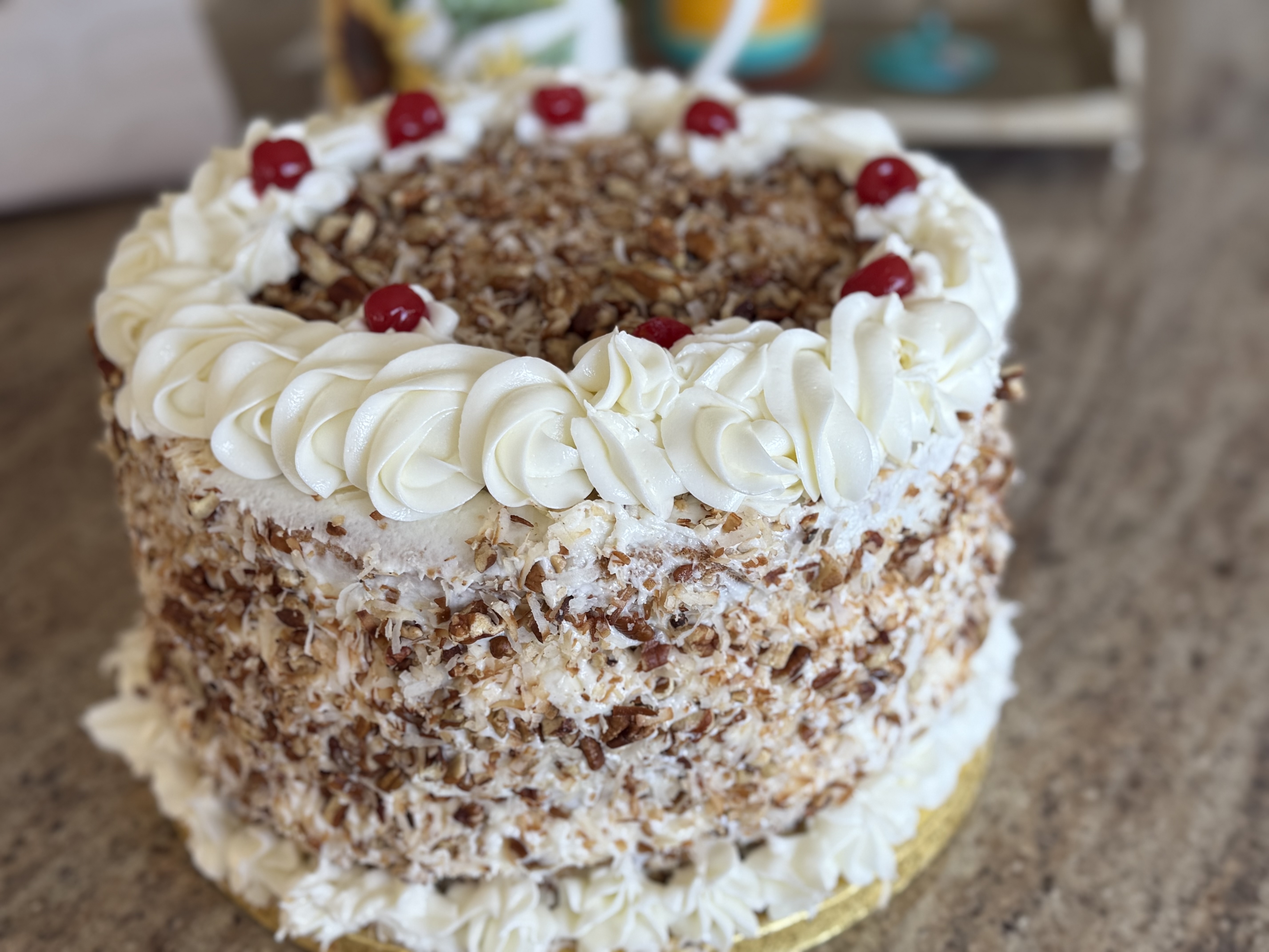 • Pipe a ring around the edge of the cake and add some toasted pecans and coconut.